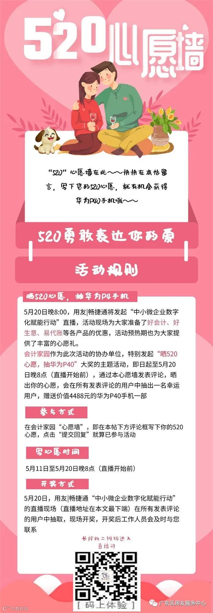 即日起至5月20日晚8点(直播开始前),通过会计家园520心愿墙发表评论,晒出你的心愿,会在所有发表评论的用户中抽出一名幸运用户,赠送价值4488元的华为P40手机一部。