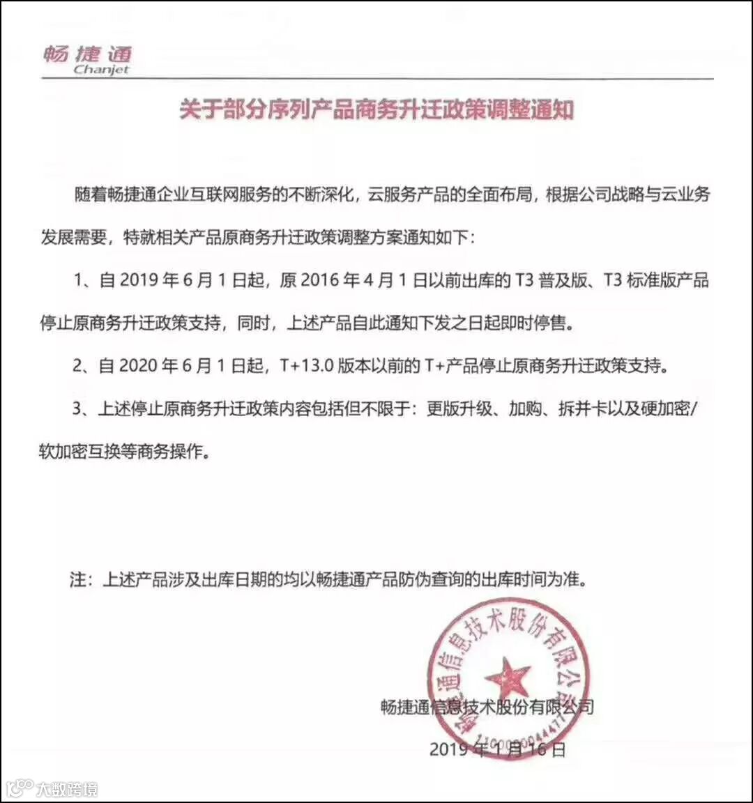 先来看一份用友畅捷通总部2019年1月16日发布的红头文件: