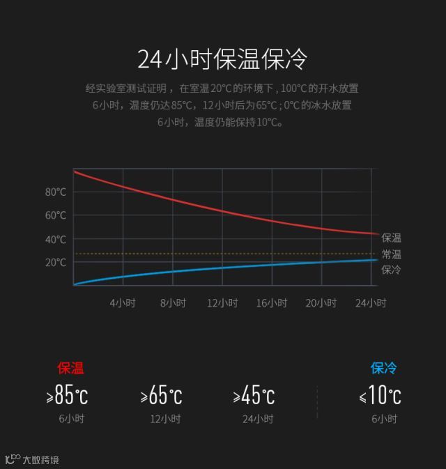 室温20°时,100°开水放置6小时温度为85°,12小时后为65°。0°冰水放置六小时仍然保持10°的温度