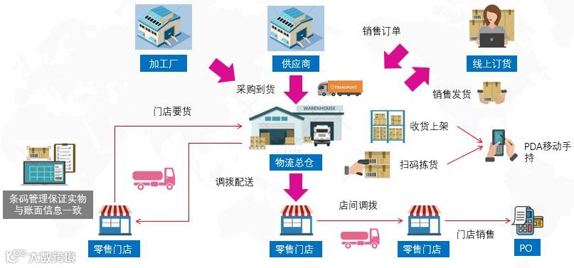 从货品采购到门店配送、从线上订单到线下销售、从基础信息共享到执行信息追溯,完成物流、信息流、资金流的同步管控。