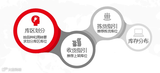 产品按货类分类存储,库内按照大件与小件分区进行推荐上架,有效提高库内存储利用率,并提高拣货效率。