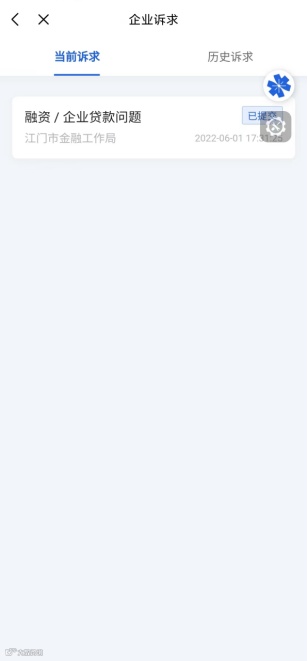 6.诉求人随时打开粤商通【江门服务专区-企业诉求】查看办理情况。有当前诉求和历史诉求两个列表。在当前诉求列表下,可看到企业已提交的诉求办理事项,并对办结事项的满意度进行评价。