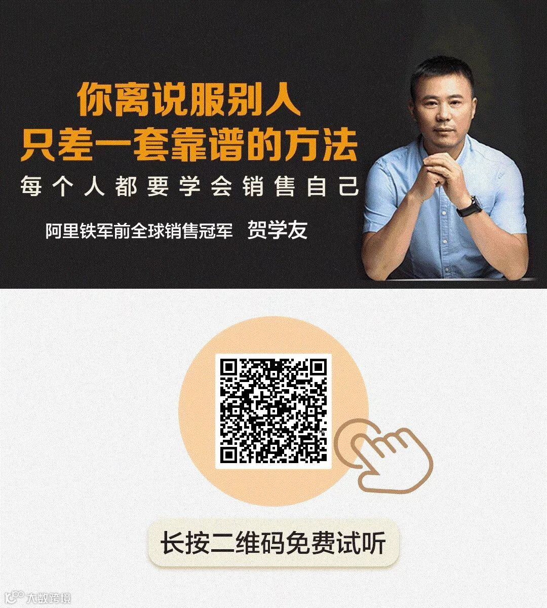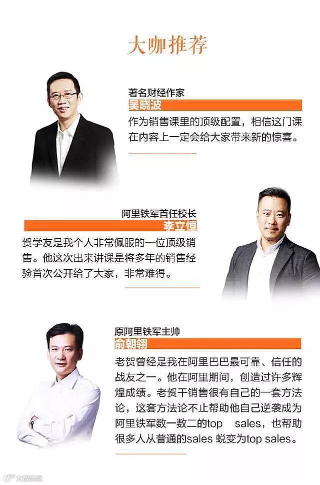 答:贺老师将自己十多年的阿里销售经验倾囊相授。线下课程售价就要31980元,本套音频全是干货,物有所值。