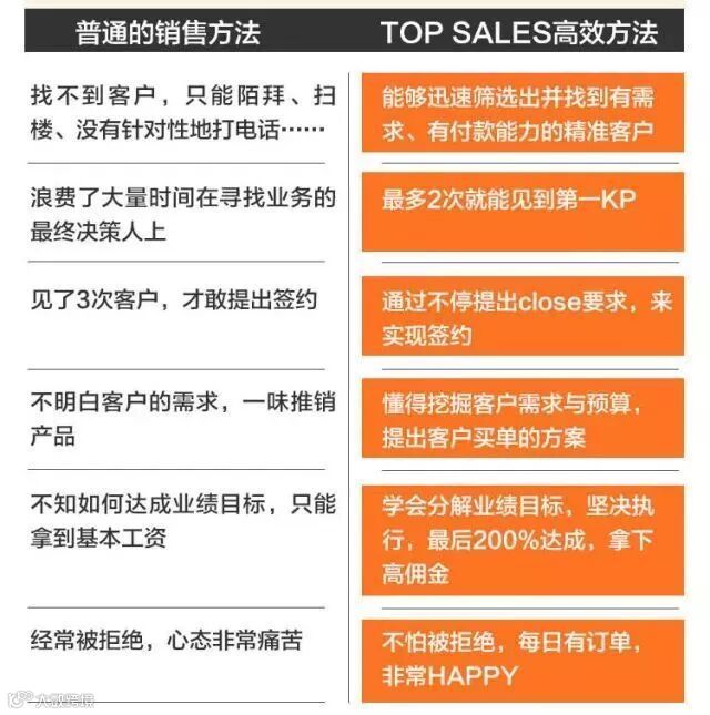 所以,针对这部分销售,高效销售法要传授的是TOP SALES才知道的快速开发精准客户的方法、快速签约方法以及面对客户的话术细节。