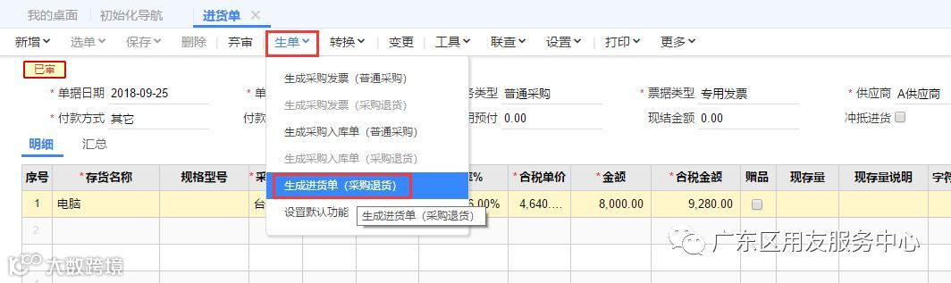 物流方面——已入库的存货退货后需要生成红字采购入库单,减少库存数量。