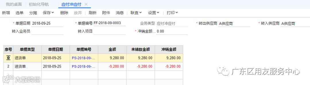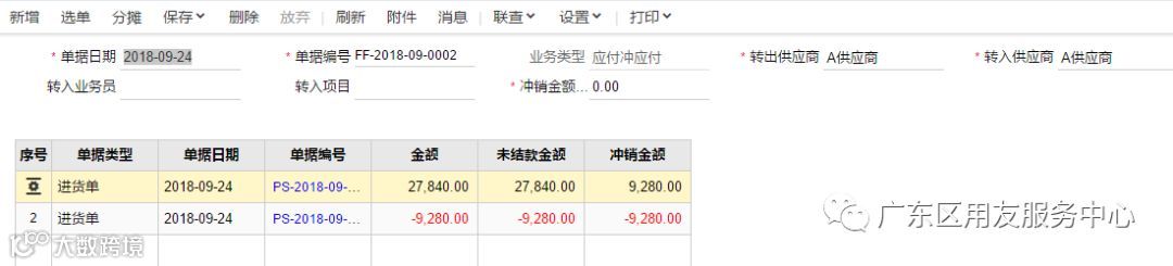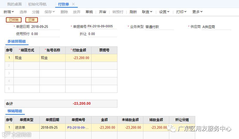 钱流方面——之前支付给供应商时已经做了一笔预付款单,预付款退回时,需要再做一笔预付款单,录入负数金额,并在往来现金模块中点击【应付冲应付】菜单,业务类型选择【预付冲预付】,选择两笔红蓝预付款单冲销。