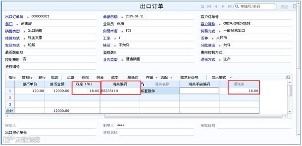 设置效果如下:增加出口订单,表体中录入海关编码,自动带出税率。