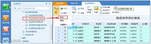 Step1:打开供应商存货价格表,点击【修改】按钮,勾选需要调整的价格表。