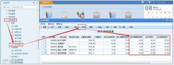 Step1:打开出口管理,设置-海关编码,点击【修改】,修改海关编码中的出口税率及出口退税税率。海关档案不支持批改。