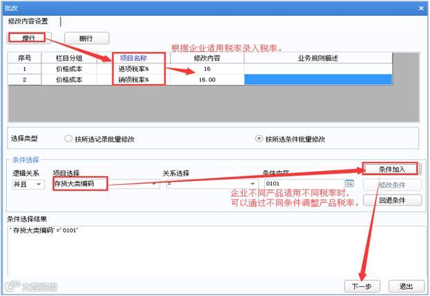 Step1:点击【批改】按钮,选择批改项目【进项税率】和【销项税率】。