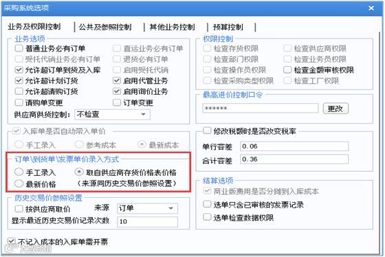 b.单据表体税率:采购单据表体税率是根据采购管理-设置-选项-业务及权限控制-订单/到货单/发票单价录入方式带出的,如下图: