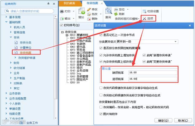 针对新增存货,需要在选项中设置税率默认值为16。