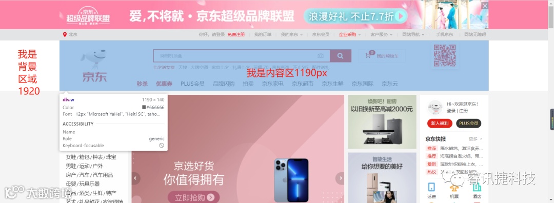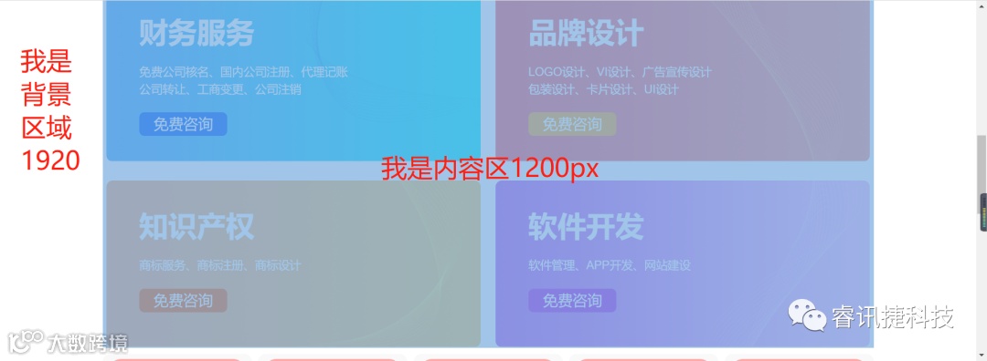 我们都知道显示器大小并非一致的。背景区域相当自由区,不管对方显示器大于1920,还是小于1920,都要保证我们的内容区的内容完全显示。