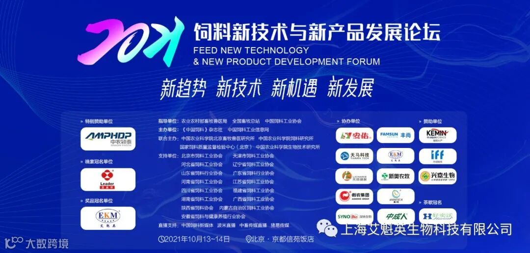 2021年10月13-14日,“2021饲料新技术与新产品发展论坛”于北京京都信苑酒店隆重举行。艾魁英作为协办单位与奖品赞助单位参与此次论坛。该论坛是由中国饲料工业信息网、《中国饲料》杂志社主办,农业农村部畜牧兽医局、全国畜牧总站、中国饲料工业协会等作为指导单位,联合艾魁英在内的多家协办单位,一起带来2021年饲料行业的深度讨论,对我国饲料工业发展适应新阶段、贯彻新理念、构建新格局,具有深远意义。