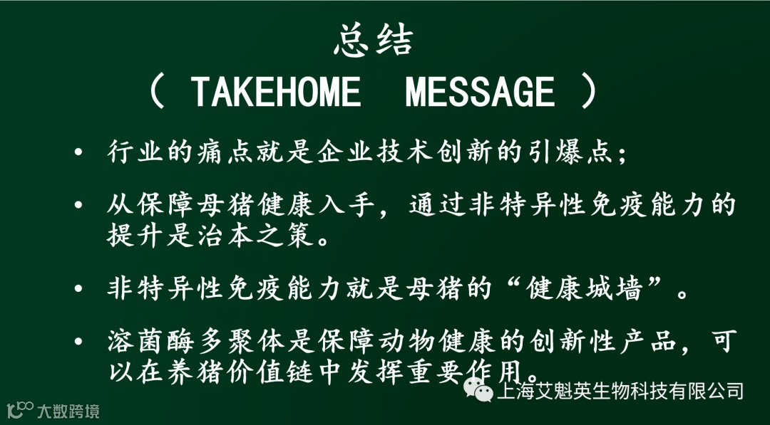 沈教授就企业的技术创新的引爆点、溶菌酶多聚体的技术创新以及溶菌酶多聚体在养猪价值链中的应用展开讨论。他特别指出了技术层面上养猪三大痛点,即疾病风险、效率与成本以及环保压力。“动物健康,治标还是治本?”沈教授给出了答案。“建立动物的‘健康城墙’是最根本解决动物健康之策”。而艾魁英公司的溶菌酶多聚体产品就是很好的解决方案。