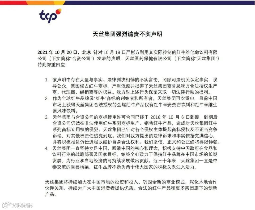 同时,天丝集团还在声明中强调,天丝集团是全球红牛品牌及“红牛”商标的创始者和所有者,目前中国市场上获得天丝集团合法授权的金罐红牛产品仅有红牛®安奈吉饮料和红牛®维生素风味饮料。