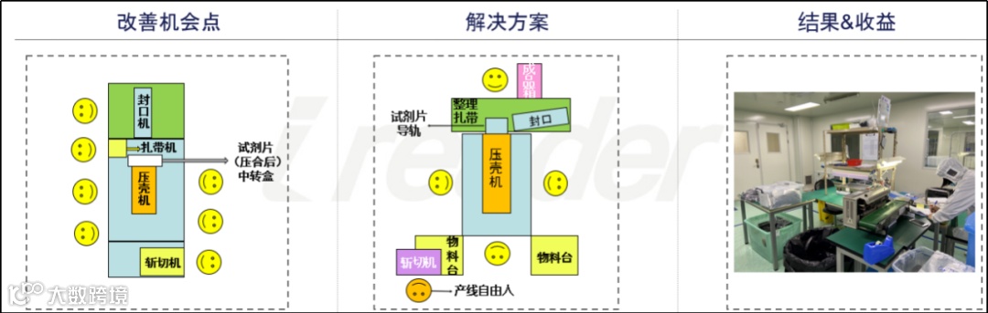 早在19年12月份,试剂生产部就在筹划2020年上半年对现有产线布局进行改造,目的是使产出效率提高,单条产线容纳人数提高,物料流得到优化。但由于3月份需求量暴增,效率优化迫在眉睫,该项目提前于2月下旬就开始了调研,讨论,准备三月初正式上线。在组织变革办公室潘老师的指导下,经过多次的讨论与模拟,3月9日产线改造项目第一个方案出炉,并于当周进行了相应的工程改造。
