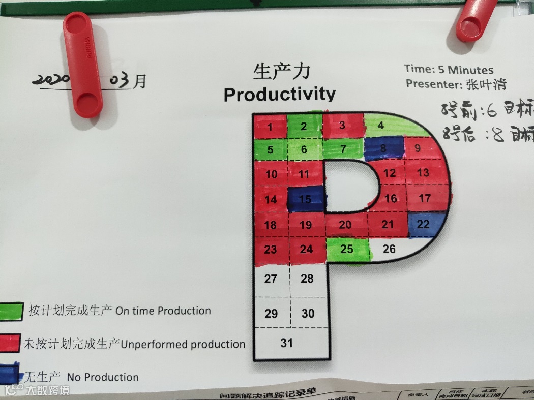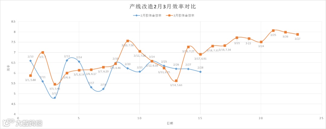 令我个人非常欣慰的是,尚未进行改造的1条生产线,也因示范效应,达到了一个非常高的效率水平。最终在3月25日,在我们采用新的标准16天之后,我们的生产力指标第一次达标。久违的绿色!