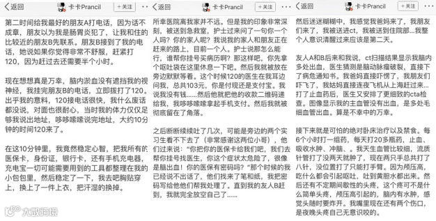 到了医院后是接连的呕吐,甚至无法清醒的办理各种手续。好在后期朋友亲人赶来。在昏迷后被诊断为大脑多处脑出血。而之后的治疗过程也极为痛苦,每天要打20多瓶药,脑内水肿,每天头疼的像炸开。吃什么吐什么,只能禁食吃流食。