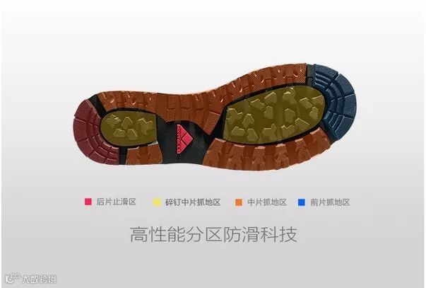 小编用颜色给大家标注出功能区域,红色后片止滑区,黄色碎钉中片抓力地区,桔色中片抓地区,蓝色前片抓地区