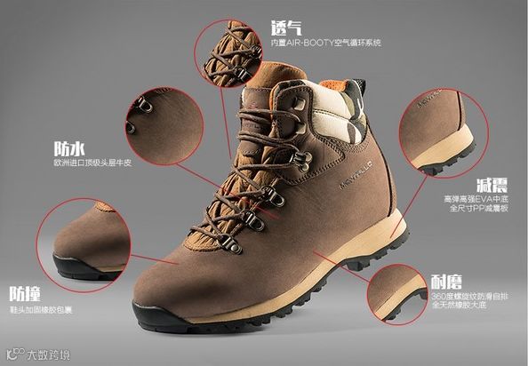 全进口欧洲高级防虹吸头层nubuck(防泼处理),防撞鞋头,鞋头加固橡胶包裹,保护行进过程中脚趾不受撞击的伤害。