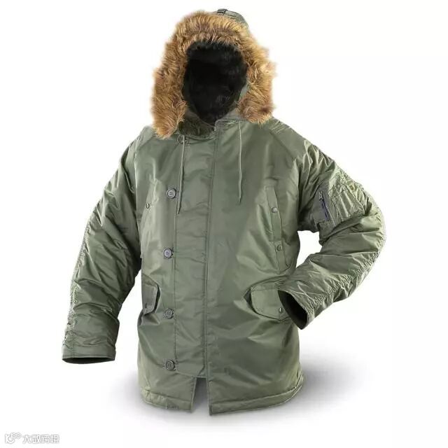 N-3B是连帽的派克式大衣,最早的N-3B外部由杜邦尼龙制成,这是一种申请过专利的面料。而它的帽子边缘有毛圈(早期为狼毛,后期为人造毛)的特点则很好的体现了因纽特人服装的特点,通常都是一体式的,不可拆卸。。