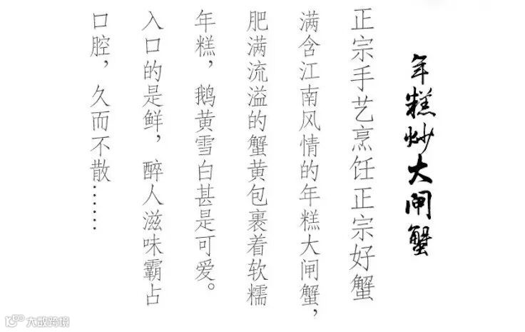满含江南风情的年糕大闸蟹,肥满流溢的蟹黄包裹着软糯年糕,鹅黄雪白甚是可爱。入口的是鲜,醉人滋味霸占口腔,久而不散……