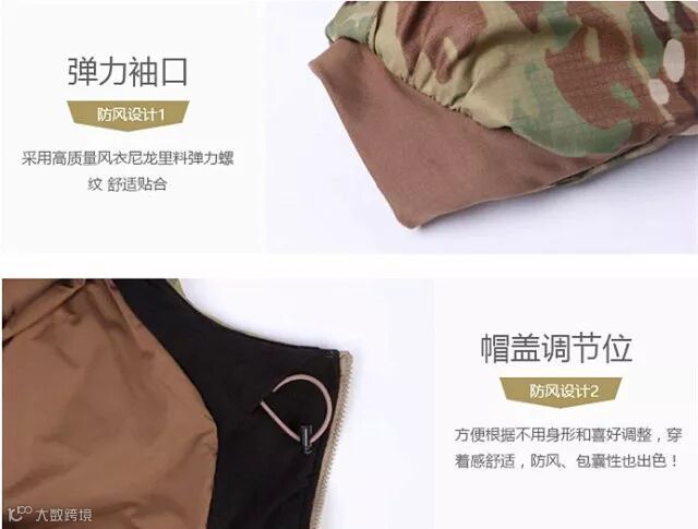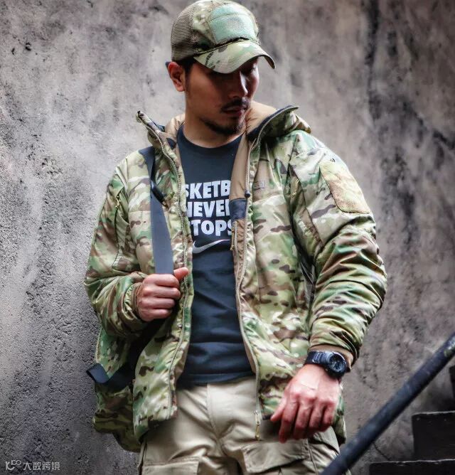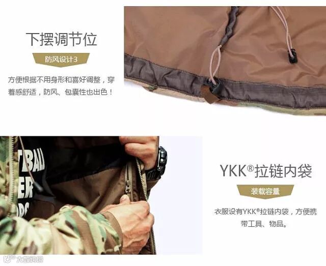 衣服表层由于BALLOON ® Urethane70D Multicam超轻DWR面料组成,中层部分为INVISTA® THERMOLITE中空高科技保暖纤维,以上两版均为美国原产,里料则为高质量风衣尼龙。