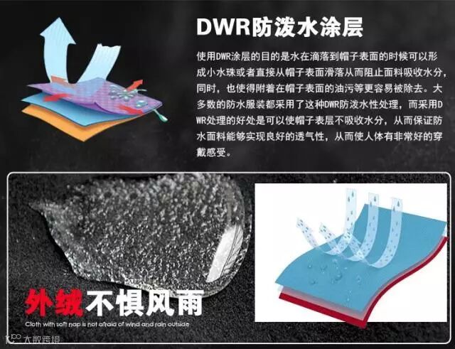 使用DWR涂层的目的是水滴落在帽子表面的时候可以形成小水珠或者直接从帽子表面滑落从而阻止面料吸收水分,同时,也使得附着在帽子表面的油污更容易被除去。大多数的防水服装都采用了这种DWR防泼水处理,而采用DWR处理的好处是能让帽子表层不吸收水分,从而保证防水面料能够实现良好的透水性,让人体皮肤有非常好的穿戴感受。