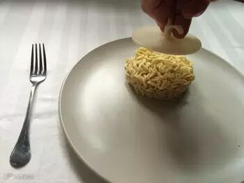 这里有个要点,需要模具。拿个小杯子就好,把方便面满满的塞进去,压实,然后扣在盘子上。