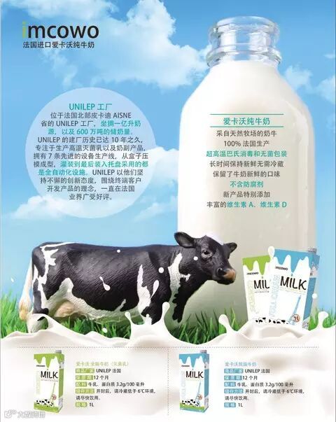 1元特供爱卡沃法国原装进口全脂牛奶1L装!