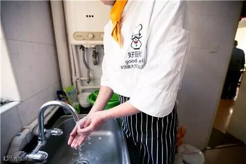 洗菜烹饪前,张师傅耐心细致地洗手。