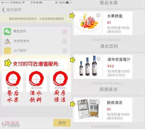 下单时,还可以用极其优惠的价格选择增值服务,餐后水果、酒水饮料、厨房保洁三个不同系列~