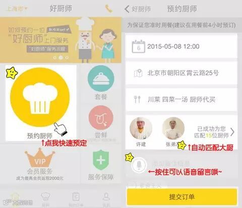 首页点击“预约厨师”根据小伙伴选的菜系和所在的地理位置,系统自动匹配大厨,快速下单!