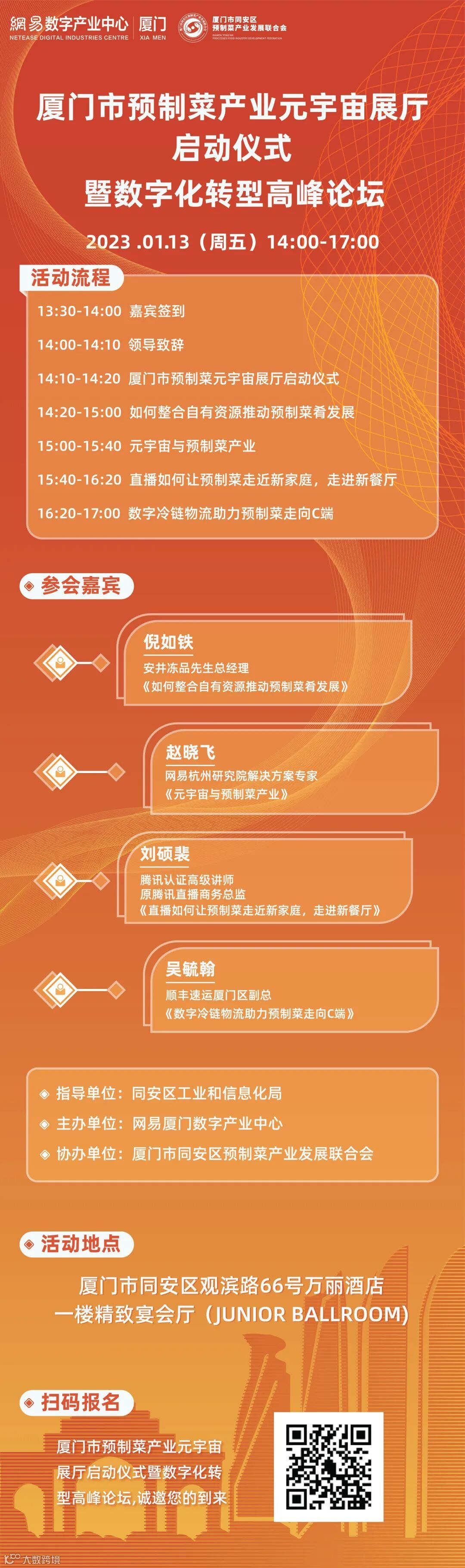 本次论坛,网易数创将立足于厦门预制菜行业企业需求,探讨交流如何将数字化运用于预制菜企业的生产、营销、物流等环节,助力厦门预制菜行业企业加快数字化转型步伐,提升企业核心竞争力,推进预制菜产业高质量发展。
