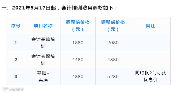 2021年5月17日起,会计培训班的费用会进行调整: