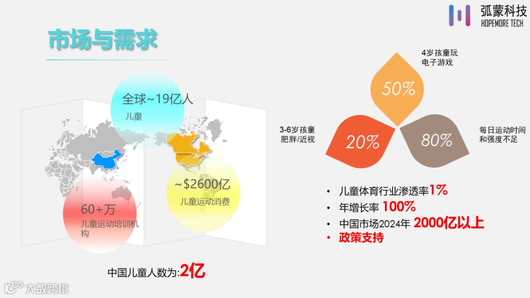 据不完全统计,中国现有儿童人数约为2亿人,其中3-6岁孩童肥胖率/近视高达20%、4孩童玩电子游戏达50%、每日运动时间和强度不足达80%,儿童体育行业渗透率仅为1%。且青少年智能运动市场尚未出现软硬件产品头部企业,具有广阔的市场与发展前景。