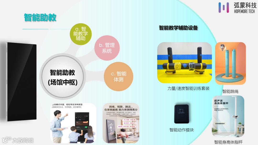 该项目由智能助教、智能营销两方面组成,可为线下培训机构打造集智能运动设备、场馆信息管理、辅助教学、智能体测、考级服务为一体的管理中枢,从硬件到软件全方位覆盖,以SaaS系统为主体,辅助线下培训机构构建科学化课程体系与培训体系。