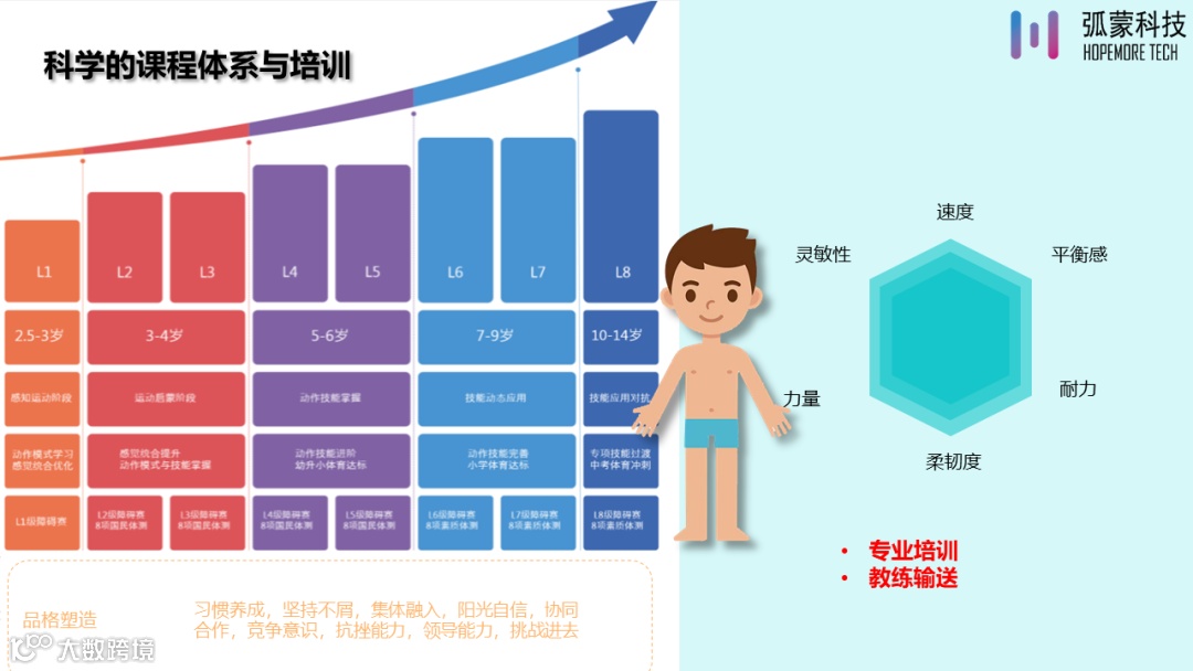 如3-6岁孩童:坐位体前屈、10米折返跑、双脚连续跳、平衡木、立定跳远、网球掷远;7-13岁孩童:1分钟跳绳、50米、坐位体前屈、50米+8折返跑、1分钟仰卧起坐、立定跳远、斜身引体等。科学的课程体系与培训,可以引导青少年塑造坚持不懈、阳光自信、协同合作、挑战进取的品格,还能跟踪青少年训练成长轨迹,帮助家长更好的挖掘孩子的运动潜力。