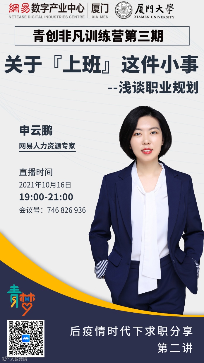 由网易厦门数字产业中心与厦门大学信息学院主办的:“网易厦门数字产业中心青创非凡训练营”第三期将继续围绕后疫情时代的求职分享为主题,以线上会议方式于2021年10月16日举行。