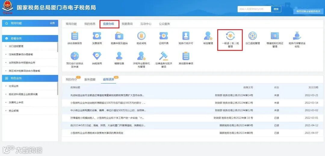 打开厦门市电子税务局,点击“我要办税”--选择“一般退(抵)税管理”。