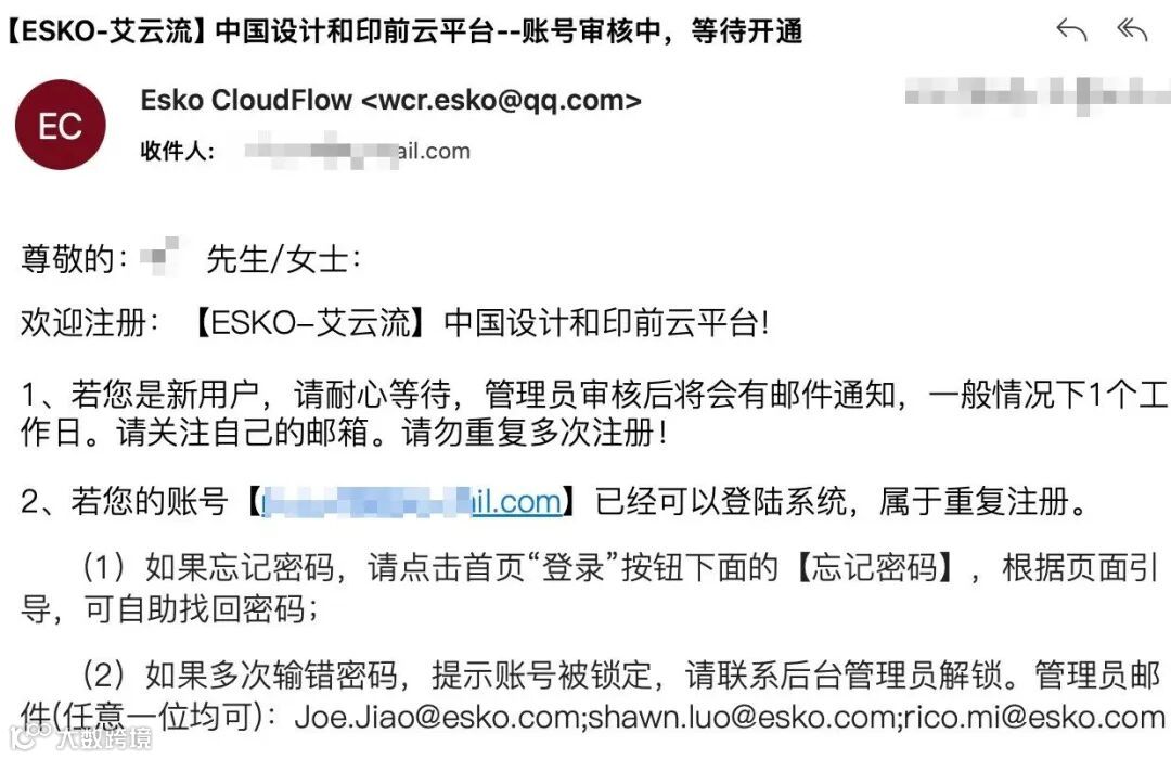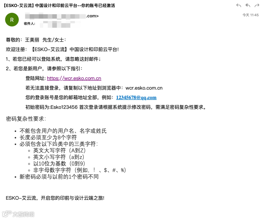 2、 若您的账号已开通,将收到一封如下的邮件,按照邮件说明登录系统,初始密码为:Esko123456 首次登录请根据系统提示修改密码,需满足密码复杂性要求。
