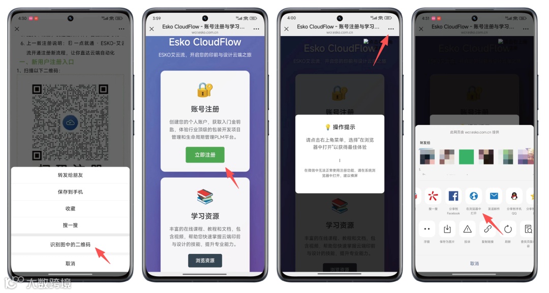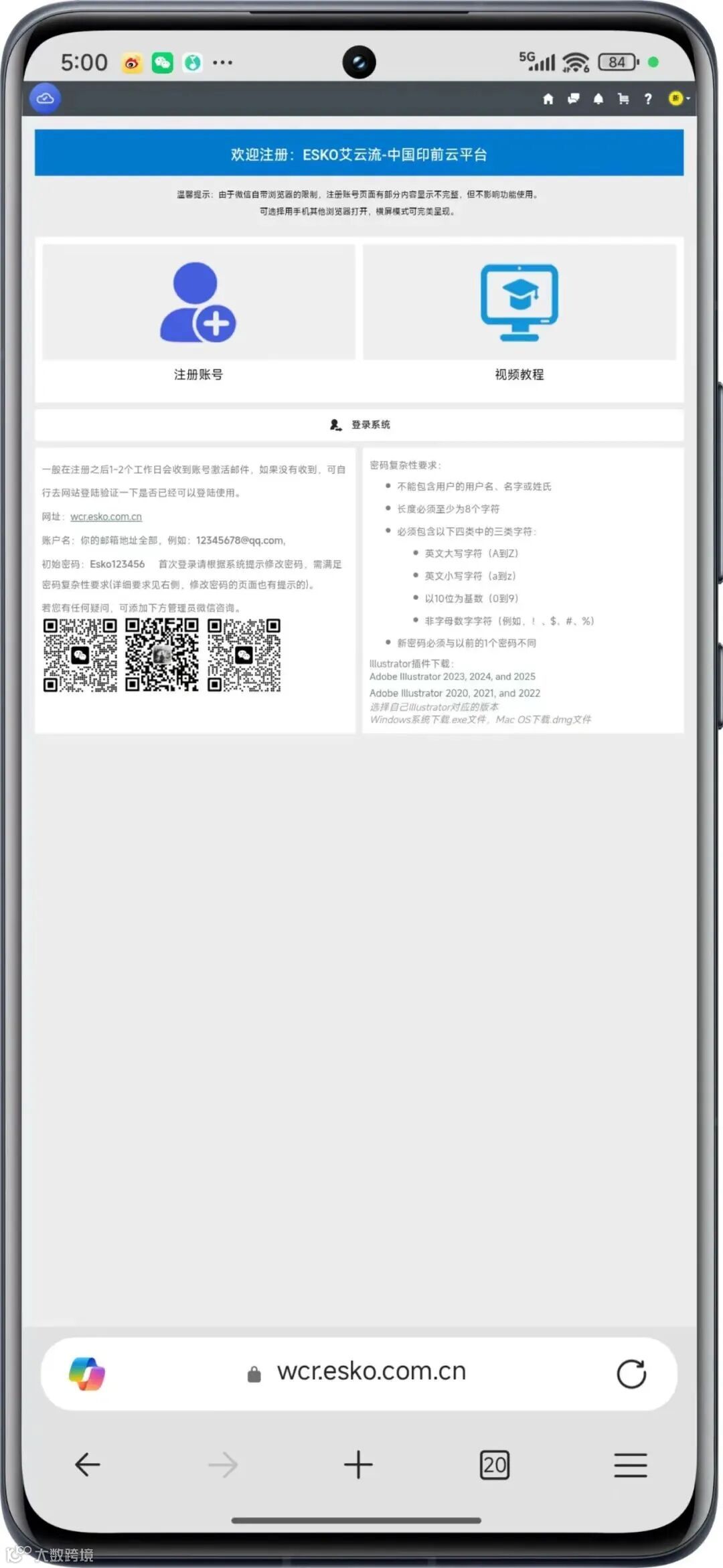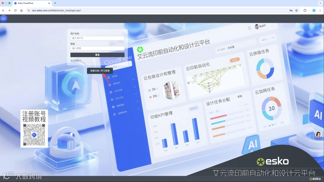 2、艾云流主页:wcr.esko.com.cn,点击:我要注册 | 学习资源 按钮