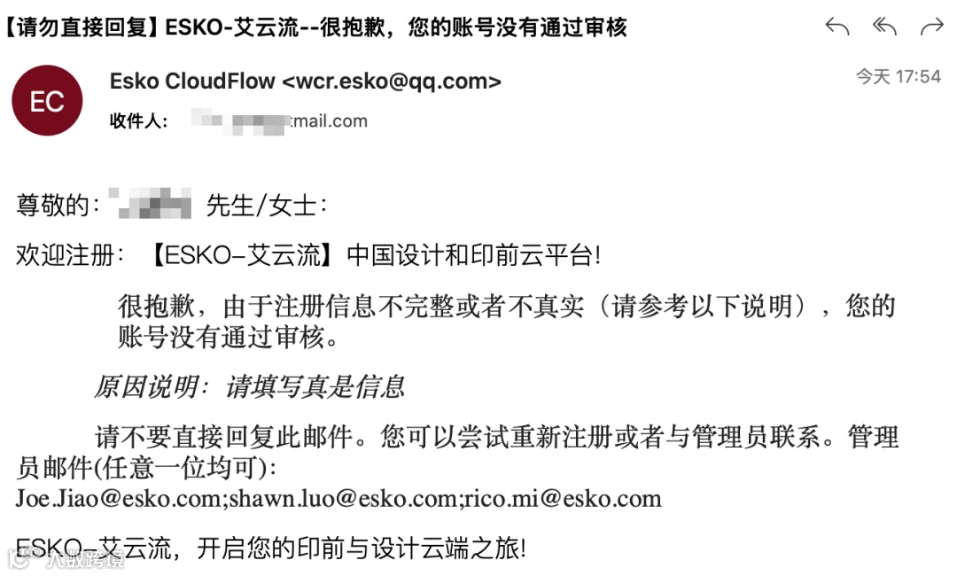 3、 由于信息填写的问题,这次申请可能没有被通过,也会收到一封如下的通知邮件,您可以尝试重新注册或者与管理员联系。