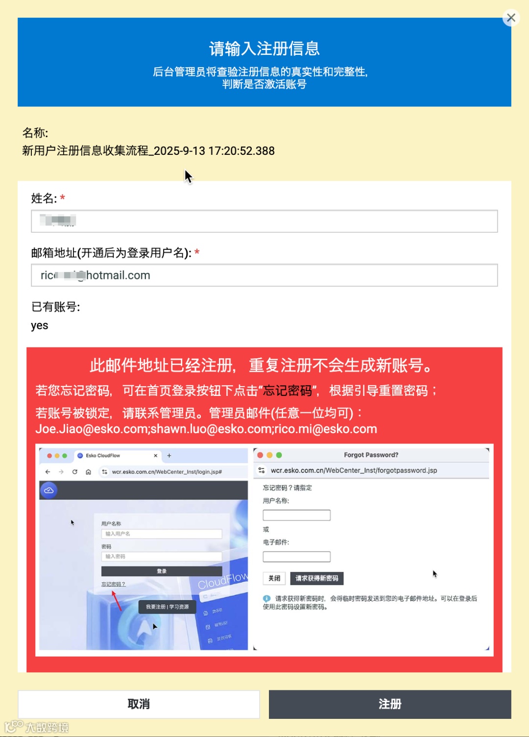 2.2 升级API调用,毫秒级响应自动判断是否重复注册。提示信息非常醒目。可以根据引导自助找回密码;若是账号被锁定,可通过邮件联系管理员。