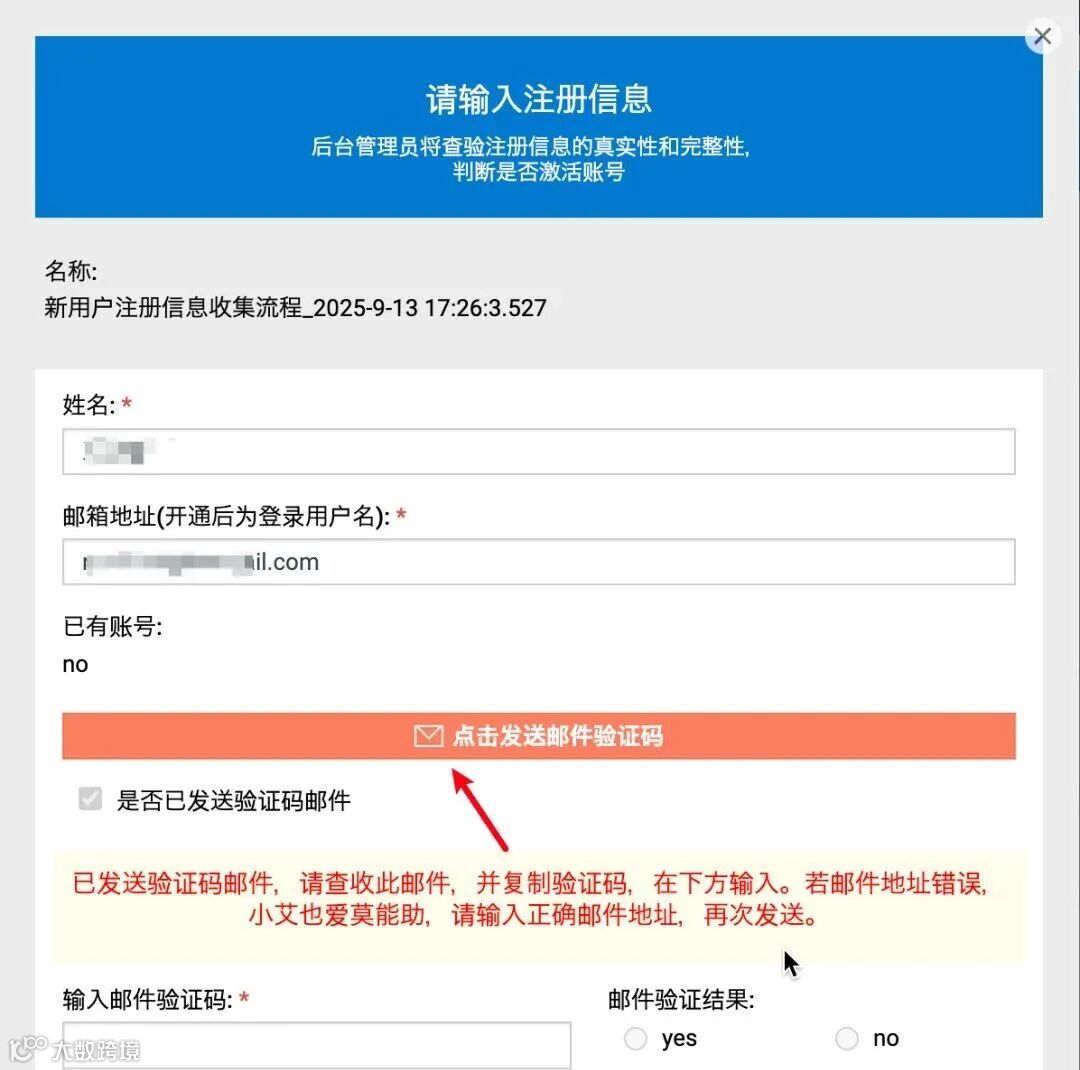 2、点击注册账号按钮,在弹出的页面输入信息。这是一个精心设计过的界面。艾云流开发团队根据前期很多人注册时碰到的问题,做了各种人性化(Fang Dai)设计。