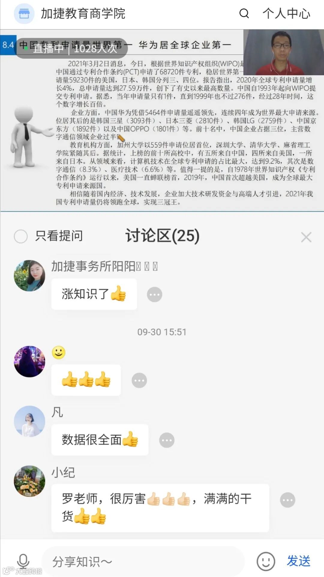 直播中,经验丰富的罗讲师运用大量的经典案例和数据为我们展示了近年来我国知识产权的发展情况和维权情况,向我们强调了企业知识产权保护管理的重要性,同时就企业研发项目申报布局与规划方面作出了精彩的解答。
