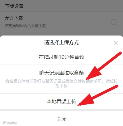 第四步:选择你需要的上传方式,可以在线录制音频或上传音频文件,这里我就从聊天记录里拉取音频文件,电脑端必须选择本地上传音频