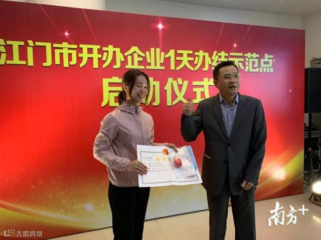 江门市副市长蔡德威为企业现场颁发营业执照与公章