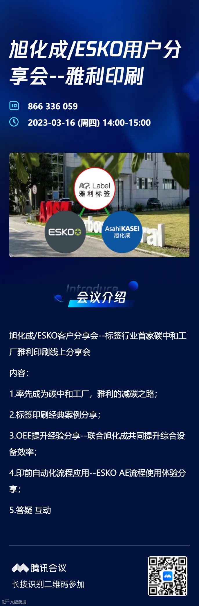 旭化成/ESKO将邀请雅利印刷技术部经理赵峰于3月16日14:00-15:00进行线上分享会,会议内容包含碳中和工厂、标签印刷经典案例、OEE提升、印前自动化流程等的经验分享。线上报名渠道已开通,扫面下图二维码即可报名参加。名额有限,报名从速!